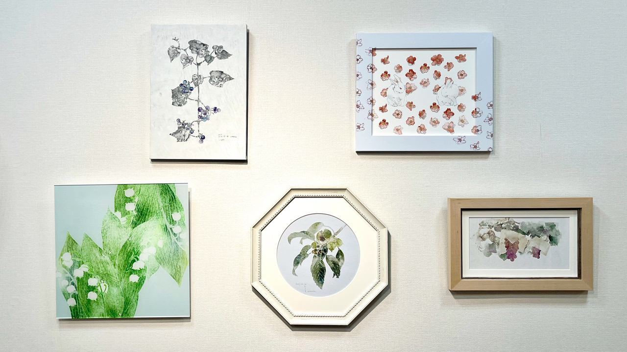 umeda様の描く植物のやわらかな色彩や繊細な魅力を、空間全体で感じていただける展示となっております。